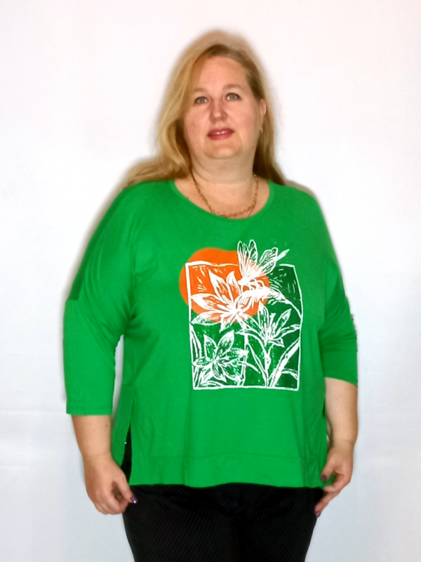Стильный блузон выполнен из высококачественного трикотажного полотна с 95% содержанием Вискозы.