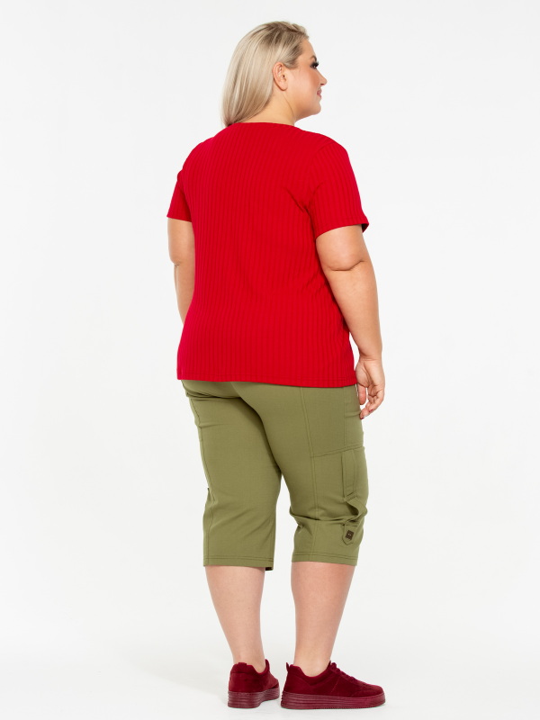 Вырез горловины V-образный, который эффектно подчеркивает шею и визуально удлиняет её.