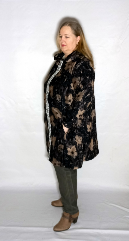 Стильный кардиган-ветровка выполнен из шанель-велюр полотна с интересным принтом. Для отделки использовали тесьму с надписями.