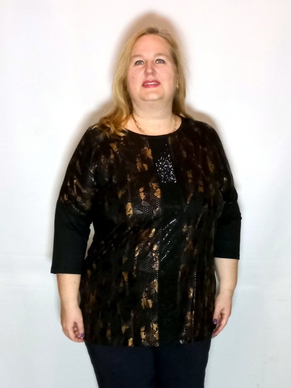 Полочка сложнокроенная, основная часть из трикотажа с рисунком, по середине вставка вертикальной полосы из однотонного трикотажа, которая декорирована черными термостразами.