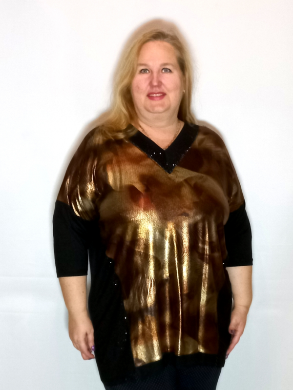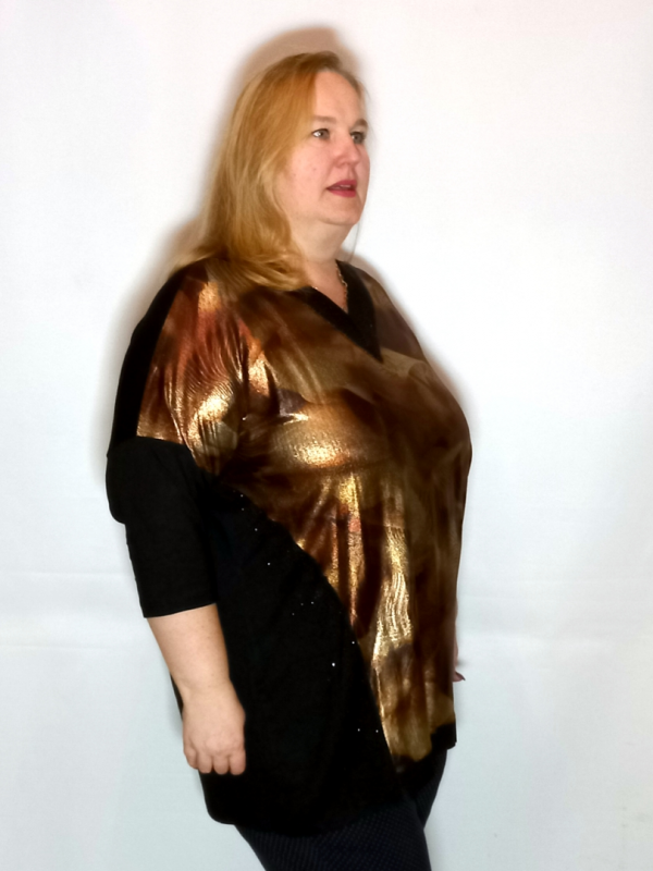 Полочка сложнокроенная: боковые вставки черного цвета, декорированы черными термостразами. Средняя часть полочки из принтованного трикотажа.