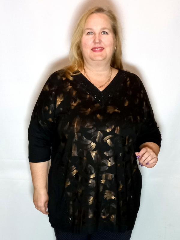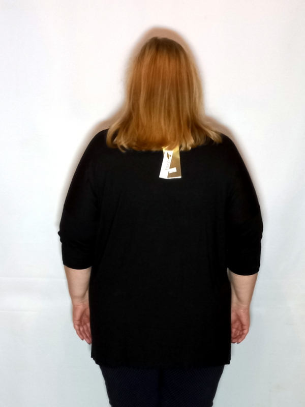 Полочка сложнокроенная: боковые вставки черного цвета, декорированы черными термостразами. Средняя часть полочки из принтованного трикотажа.