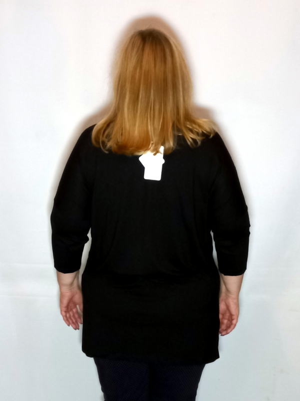 Полочка сложнокроенная: боковые вставки черного цвета, декорированы черными термостразами. Средняя часть полочки из принтованного трикотажа.