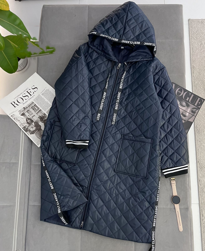 Стильная, удлиненная демисезонная куртка выполнена из курточной стежки. Слежка шуршит, утеплитель синтепон.