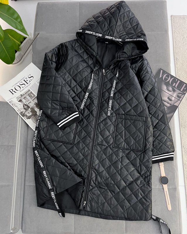 Стильная, удлиненная демисезонная куртка выполнена из курточной стежки. Слежка шуршит, утеплитель синтепон.